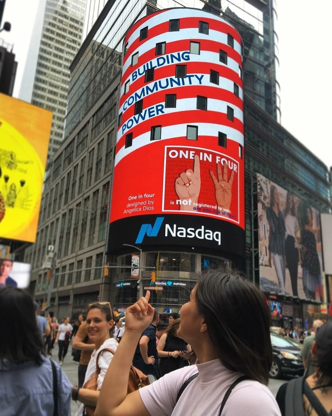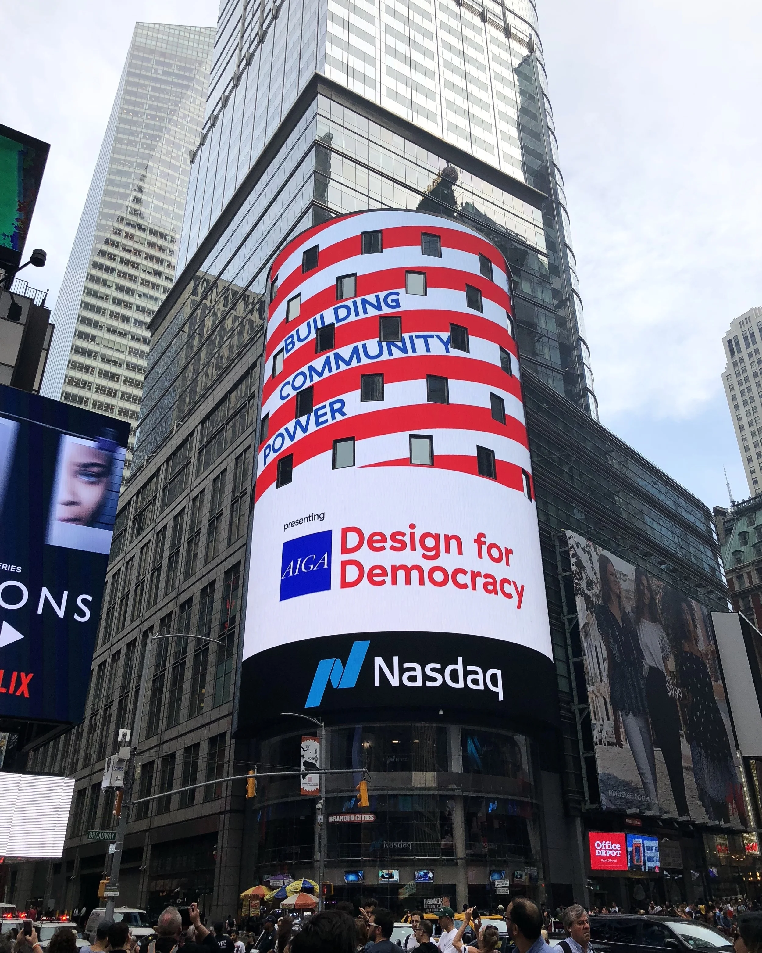 A jury composed of Harry Allen for Design Pavilion; Tim Tompkins for Times Square Alliance; Ally Kostick, Global Brand + Creative for NASDAQ; Frances Yllana, co-chair of the Design for Democracy committee; James Hill of Nonprofit VOTE; Laura Peres, Pratt MFA student; and famous design advocates Milton Glaser and Luba Lukova selected the submissions that were showcased in the Nasdaq Tower.